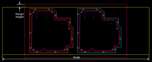 - Margin Height: Enter the margin between the boundary line (highlighted in yellow) and the panel PCB outline (highlighted in magenta) of the upper or bottom side.