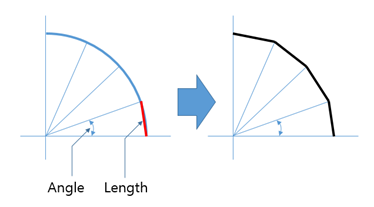 - Length: Divide ARC to small line based on length specified in Divide Value. The figure below shows ARC divided into 10 degrees.