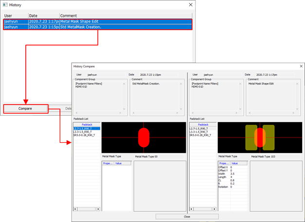 - Show History: Review the last updates and compare the changes. Upon selecting component and clicking Show History, history display dialog will open. Select target histories and click Compare to see the metal mask shape’s updated contents.