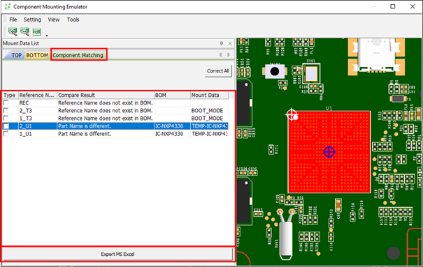 Correct All: Corrects mounting coordinate with checking component matching