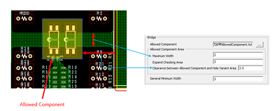 - The maximum allowable value is 1.5mm in the area where the bridge passes through the allowed component. When the Allowed Component COC area is expanded by Expand Checking Area, the bridge width in that area should be smaller than Maximum Width.