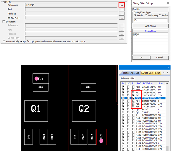 For example, when selecting the Prefix and entering FL in the string filter dialog, all first pins of the reference name starting with the string FL are selected in the reference list.