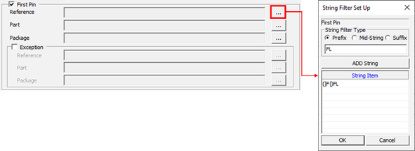 You can set the parts to display in the string filter dialog based on the reference, part and package names. When entering FL after selecting Prefix in the String Filter Set Up dialog, the polarity mark displays at the first pin of the reference name that starts with FL (case insensitive).