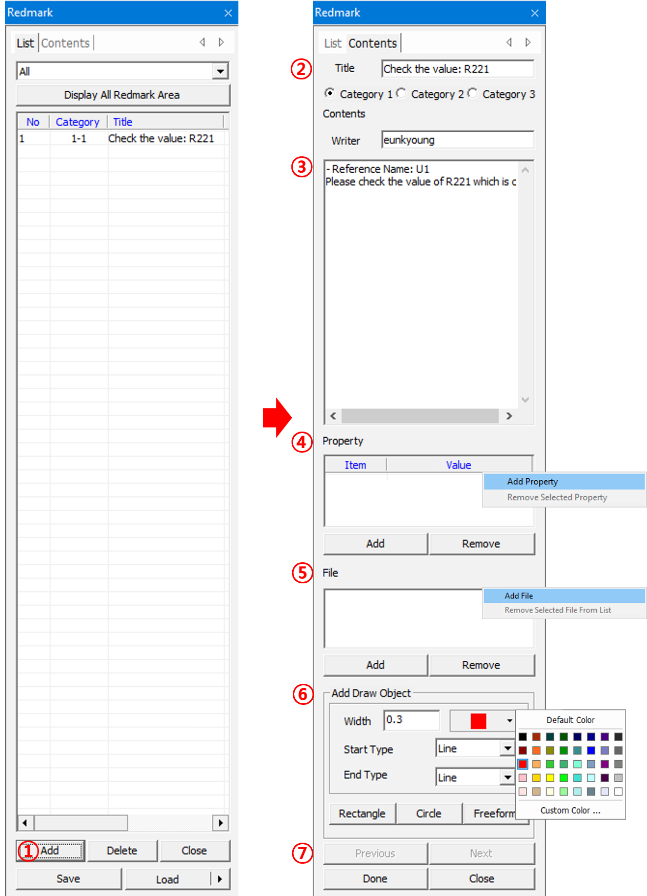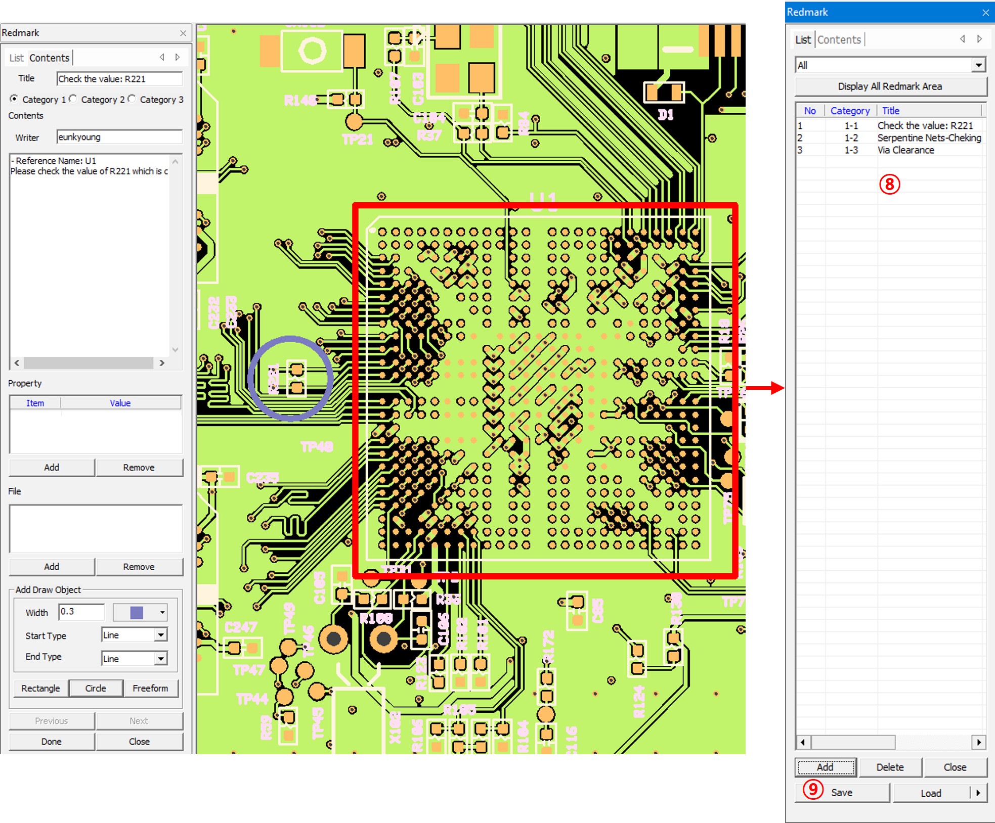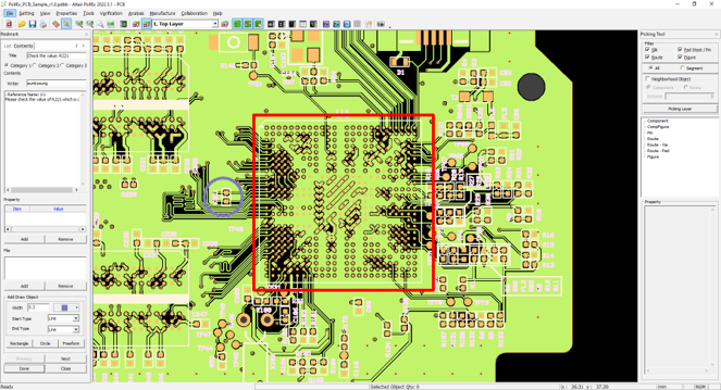 While exploring PCB design, if you input a Redmark comment and save, all Redmarks will be saved in the PDBB file. When others open the design file later, previously added Redmark comments are visible.