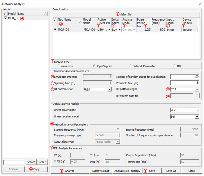 - Analyze: three types of simulation will be started by this button. The desired nets for the simulation should be checked as in the V column.