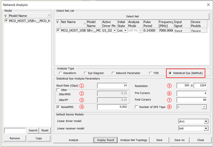 The Network Analysis dialog includes the Statistical Eye (Bathtub) option, indicated by the red box in the image below. This option enables users to perform statistical eye analysis and bathtub analysis when importing an IBIS-AMI model for SerDes analysis. The IBIS-AMI model can be added from the menu bar, click