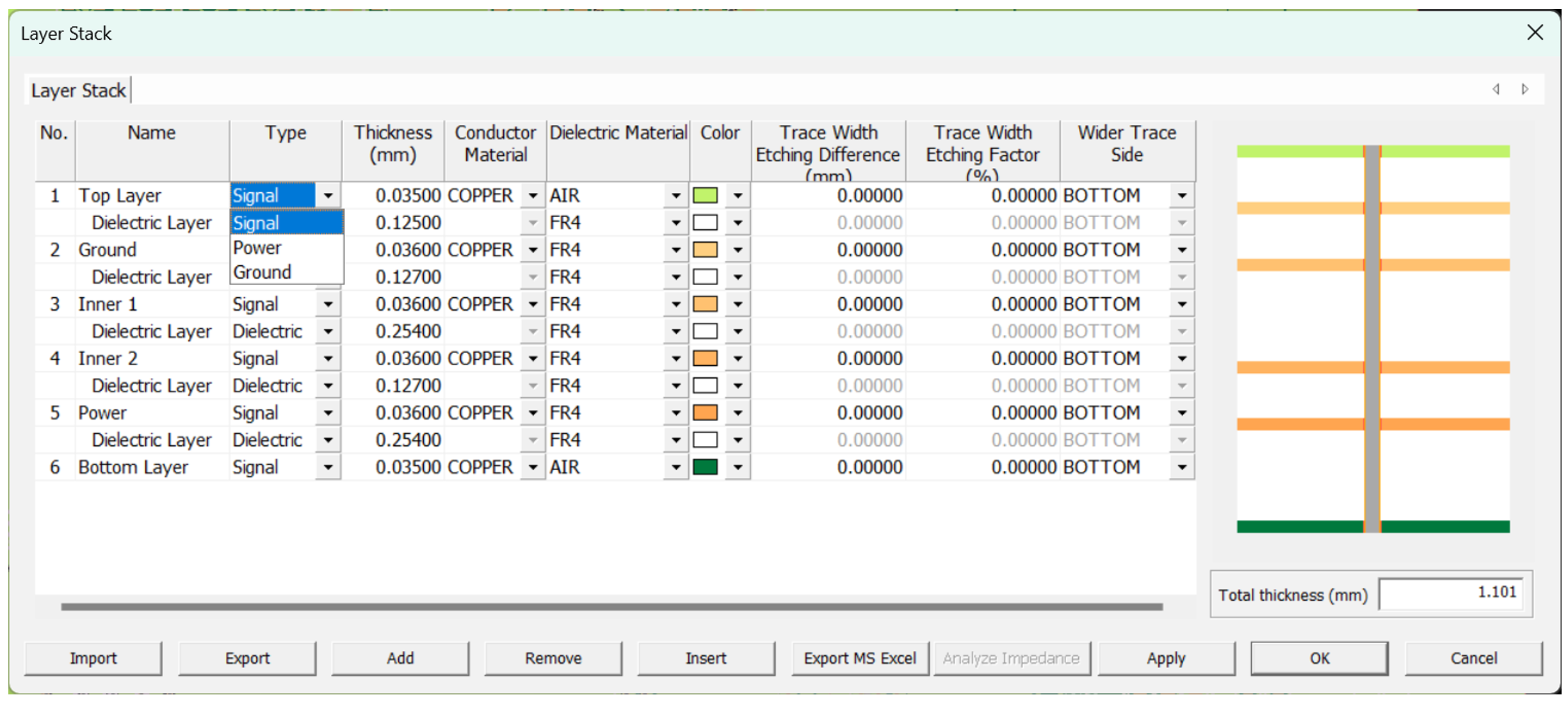 as Power and ground plane as Ground as displayed above. Available layer types are
