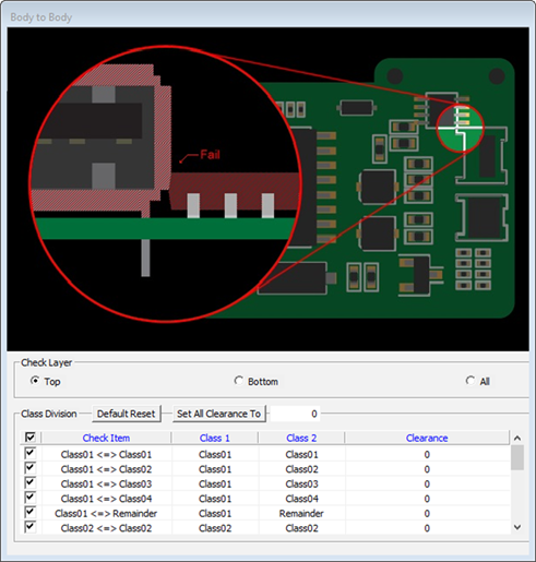 This item checks the clearance between component body and component leads. Measurement base is 3D package’s body surface to another packages’ lead. Checking is performed for classes’ compositions which are automatically created by PollEx DFA. Applied clearance values are BDC (Body Default Clearance) and LDC (Lead Default Clearance) value that you input while making each class. You also can change this value.