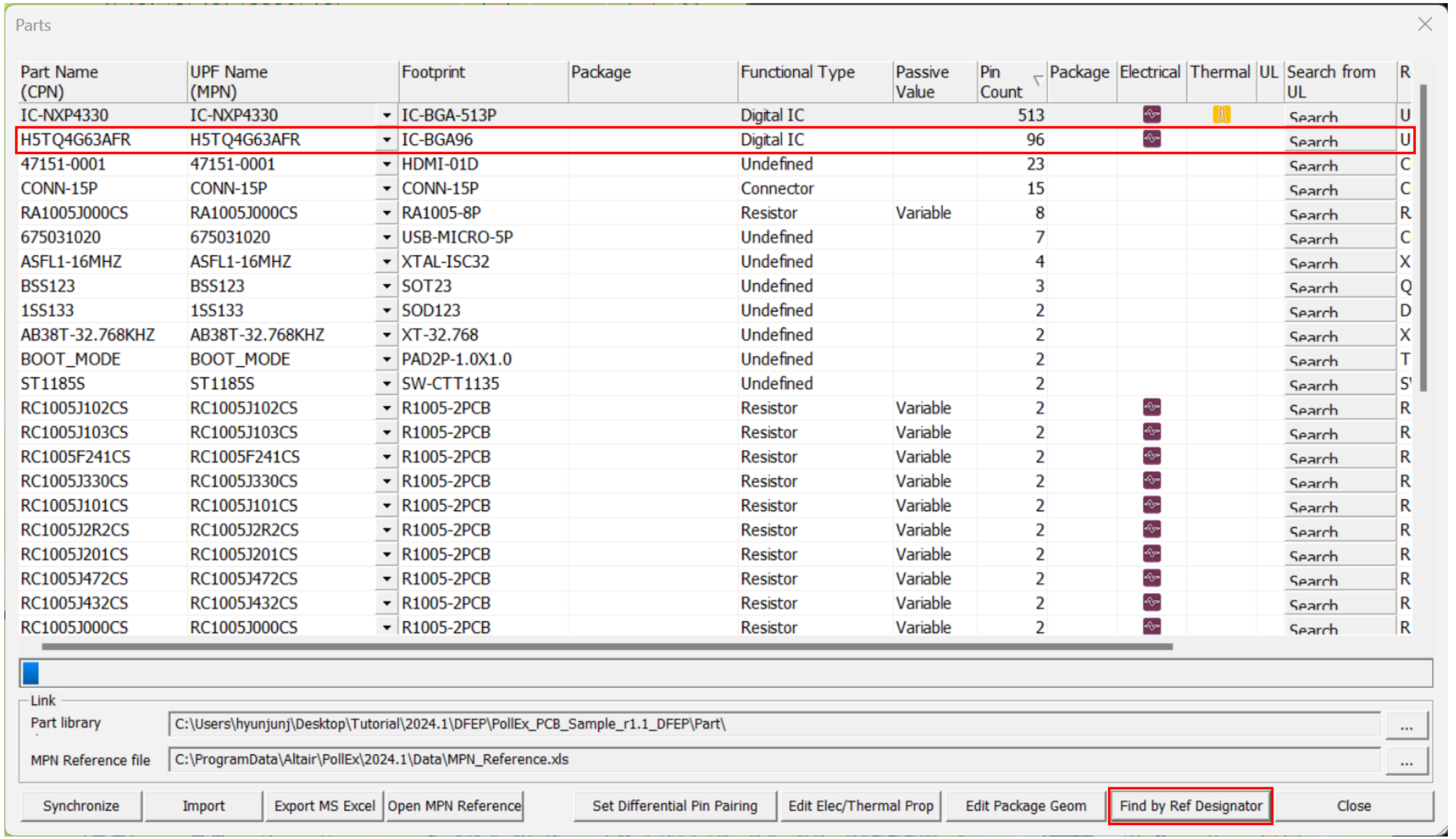 The Parts dialog shows the status of the properties assignment to the parts which are included in the current PCB system to analyze. The unified parts created by PollEx UPE can have versatile information such as electrical buffer model, package thermal parameters and 3D package geometry which needed for electrical, thermal and 2D/3D assembly analysis (by PollEx DFA and PCB assembly viewer) and it would be stored in specific folders in local or server system.
