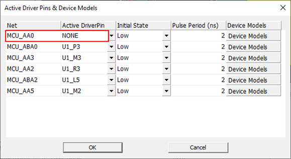- Active Driver Pins & Device Models: Click then Active Driver Pins & Device Models dialog is invoked. User can define whether the excitation signal is applied or not for each aggressor nets here. By changing the Active Driver Pin assignment as None. The Net will not be excited. Just do the crosstalk analysis with all aggressor nets are excited. You can change the Initial State, Pulse Period(ns) and Device Models by clicking these for the desired net.