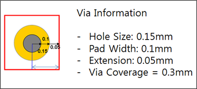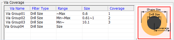 - Coverage: Distance from hole center. A circular area from hole center will be a via coverage region.