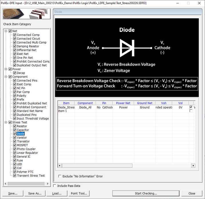 This item tracks the voltage and signal lines in the circuit, calculates the voltage value of each net, and checks whether the all diode connected to the net is within the allowable voltage range.