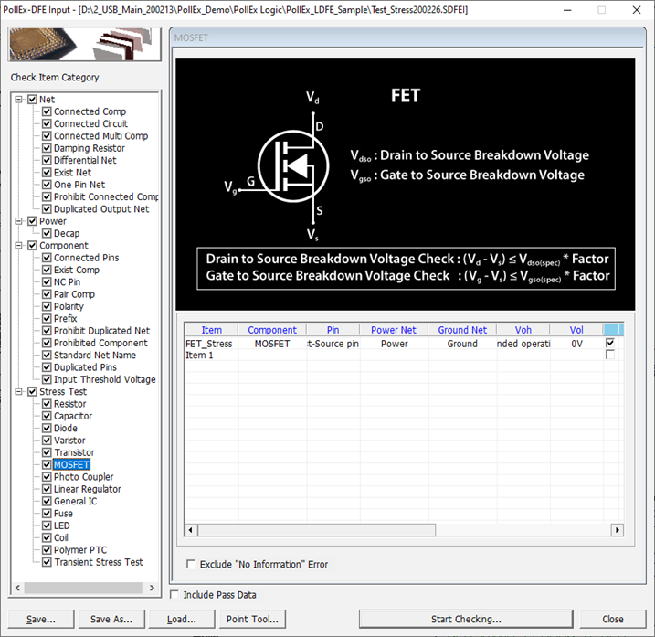 This item tracks the voltage and signal lines in the circuit, calculates the voltage value of each net, and checks whether all MOSFET connected to the net is within the allowable voltage range.
