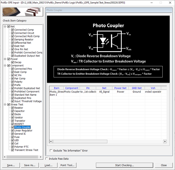 This item tracks the voltage and signal lines in the circuit, calculates the voltage value of each net, and checks whether the all photo coupler connected to the net is within the allowable voltage range.