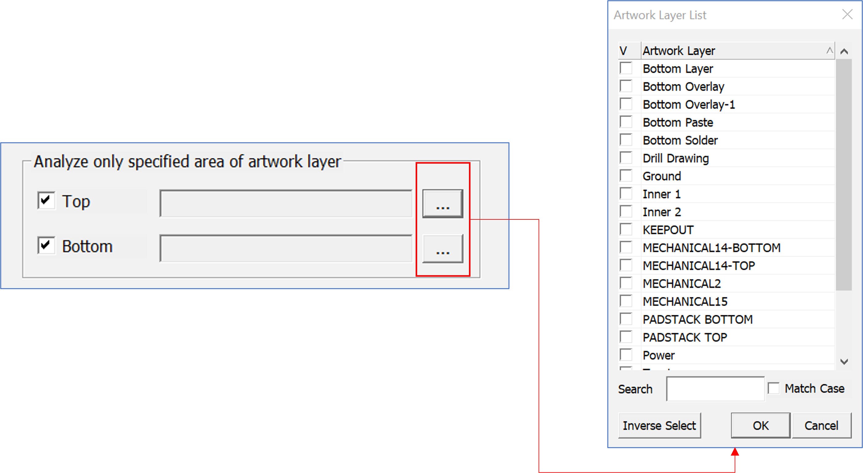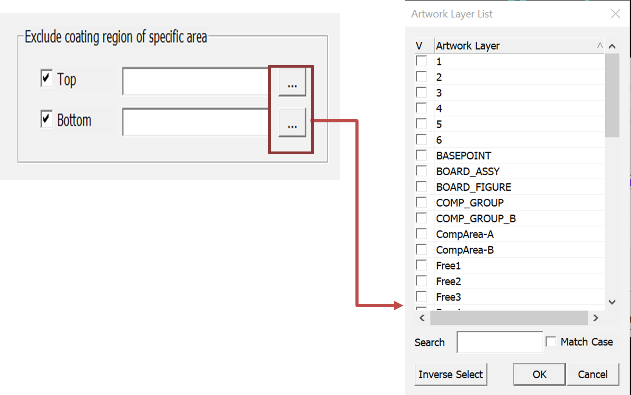 design to exclude between the TOP and BOTTOM layers.For either the TOP or BOTTOM region a specific area can be selected using the artwork layer list dialog bar.
