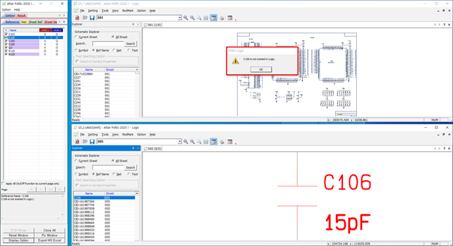C106 exists in PCB design only. In the LOGIC window, there is no