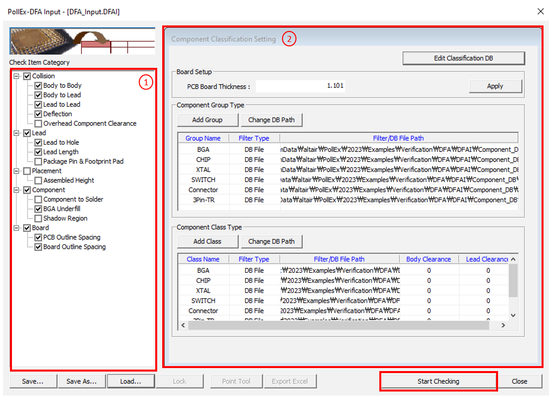 - To load the DFA rule file, click Load and select the DFA_Input.DFAI file from C:\ProgramData\altair\PollEx\<version>\Examples\Verification\DFA\DFAI .