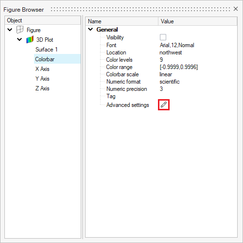 The Property editor in the Figure Browser displays the basic properties of a colorbar. Click on the Advanced settings icon to open the Edit Colorbar dialog.