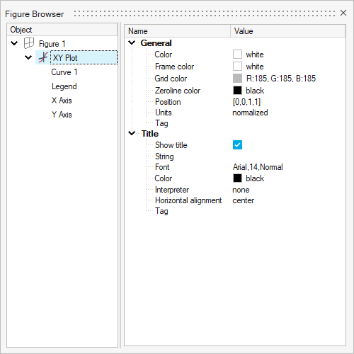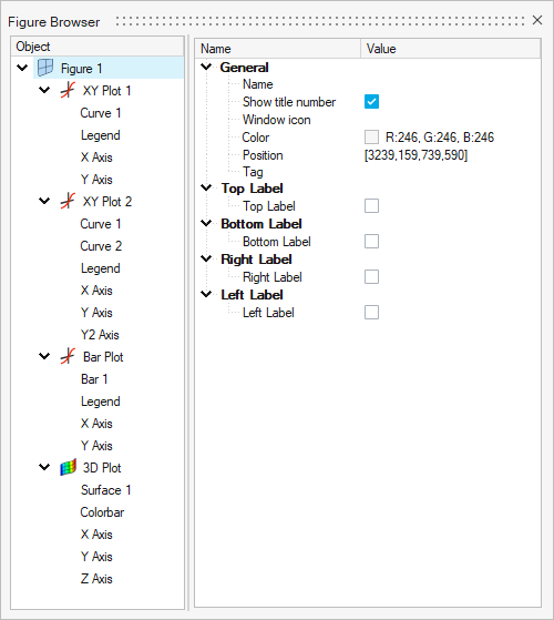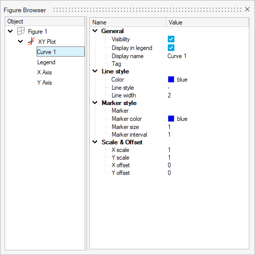 The Figure Browser dialog allows you to graphically edit the style properties of figure and plot elements. The dialog contains the Figure browser tree and the Property editor.