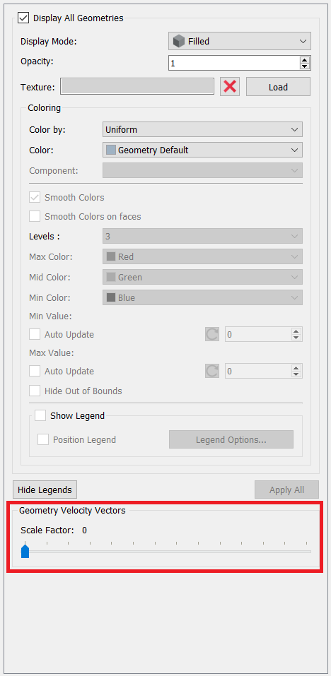 Note: Dragging the slider to the left decreases the size of the vectors.The widget is only enabled when at least one of the Geometries has motions that are calculated through the Multi Body Dynamics interface.
