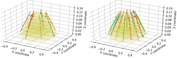 The domain limits must be conservatively selected on the basis of the steepest conical pile in the calibration exercise and can then be applied for all other cases. The bin size must be set between 3-4 average particle diameters as shown in Figure 1. Select the number of radial measurements so that there is no overlap between bins. Typically, eight measurements ensure that this condition is met while producing a sufficiently accurate averaged value for the Angle of Repose. The analysis can be applied to any simulated conical granular pile, only if the pile is produced near the origin of the simulation coordinate system.