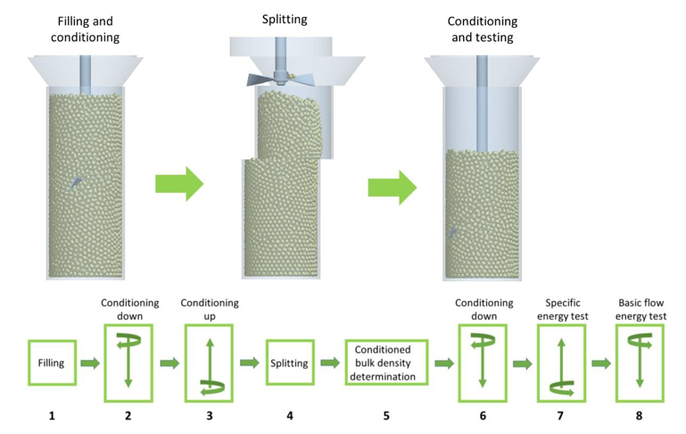 The FT4 Basic Flow Energy test consists of force and torque measurements on an impeller blade moving through a cylindrical bed of granular material. The test is performed at different magnitudes of helical velocity of the blade, also known as 'blade tip speed' as shown in Figure 1. The work done by the impeller blade is calculated from the force and torque measurements and is used as an indication of the flowability of the material. The standard test procedure at a given blade tip speed is shown in Figure 2.