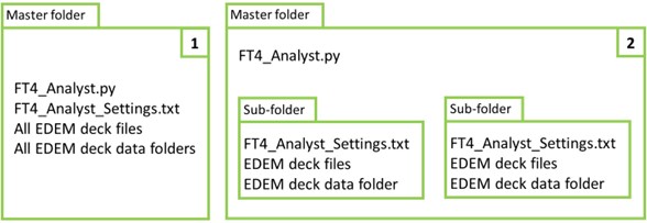 You can post-process multiple simulation decks with the script by arranging the files into one of the two configurations as shown in Figure 4. The second configuration is recommended, as it allows for individual settings files for each EDEM deck, and therefore post-processing of different types of tests can be done simultaneously. In the first configuration, a single settings file is read for post-processing all decks.