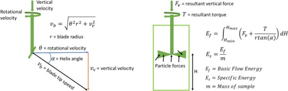 The relatively high velocities of the blade and the helical motion of the impeller through the sample lead to a complex state of stress and a dynamic flow regime. These conditions may approximate the ones induced in dynamic systems such as high shear granulators and mixers. The results are less relevant for systems in the quasi-static flow regime.