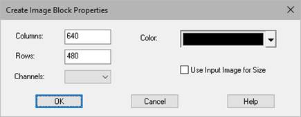 Use Input Image for Size: Uses the input image to calculate the dimensions of the output image. When this parameter is activated, an input connector for the input image is added to the Create Image block.