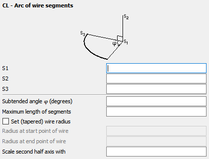 - If checked, the radius set at the previous IP card is overridden for the current arc. This setting does not affect segments created after this card. Both radius values are in metres and are affected by the SF card scaling factor. If only the start radius is specified, the arc will have a constant wire radius.