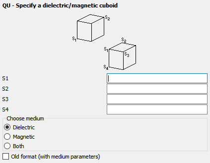 format is retained for backwards compatibility purposes. Note: It is not recommended to use the old card format for new models.The current format requires that, prior to the QU card, the DI card is used to define the material parameters and the ME card is used to specify the type of tetrahedra. When checking this option, the panel layout will change to the old format (depending on the selection whether dielectric or magnetic cuboid) so that the material parameters can be entered. Feko then uses a compatibility mode and creates artificial media with names QU_MED_xx where
