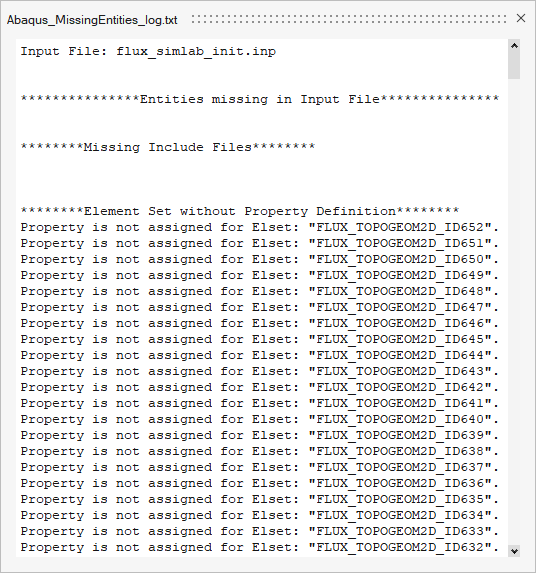 → The Flux project is imported in SimLab and the database SimLab is created with all corresponding Bodies, LBC,...→ A log is opened with the list of missing entities