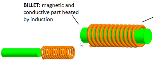 (New) The studied device is composed of a mobile billet and a supply inductor. The goal is to simulate a forced cooling process at the end of heating (when the billet is out of the coil). |
