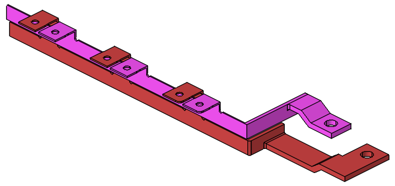 (New) The device studied is a busbar. It is a copper device and the purpose is to calculate the joule losses in the geometry, and the electric current in the RL loads. |