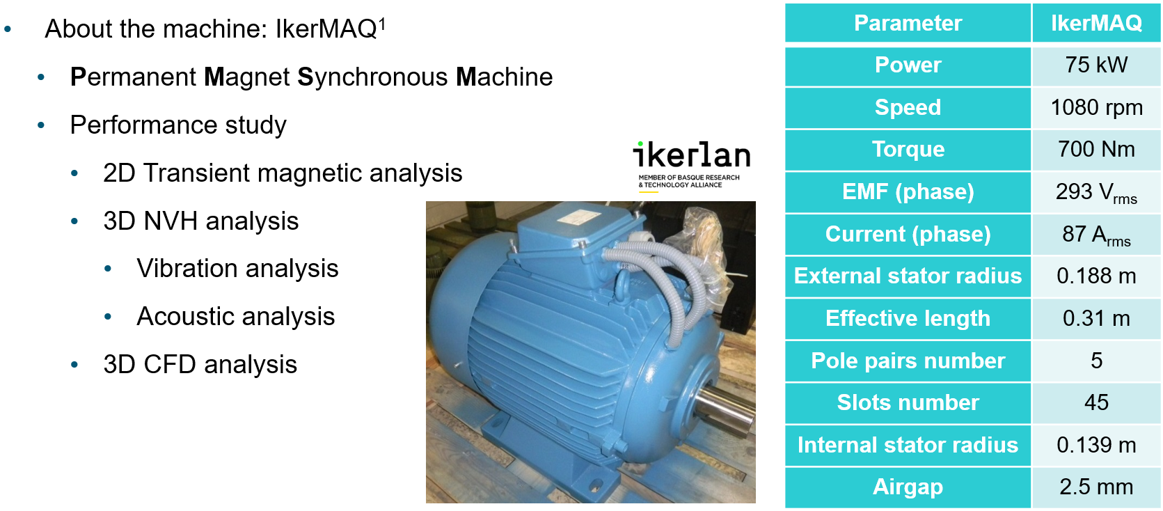 The studied device, represented in the following figure, is a surface inset permanent magnet synchronous machine (PMSM) used on traction applications with a 75 kW power rating. It is a three-phase machine with 45 stator slots and 10 rotor poles made from M800_65A steel. It operates in the motor mode in this application case.