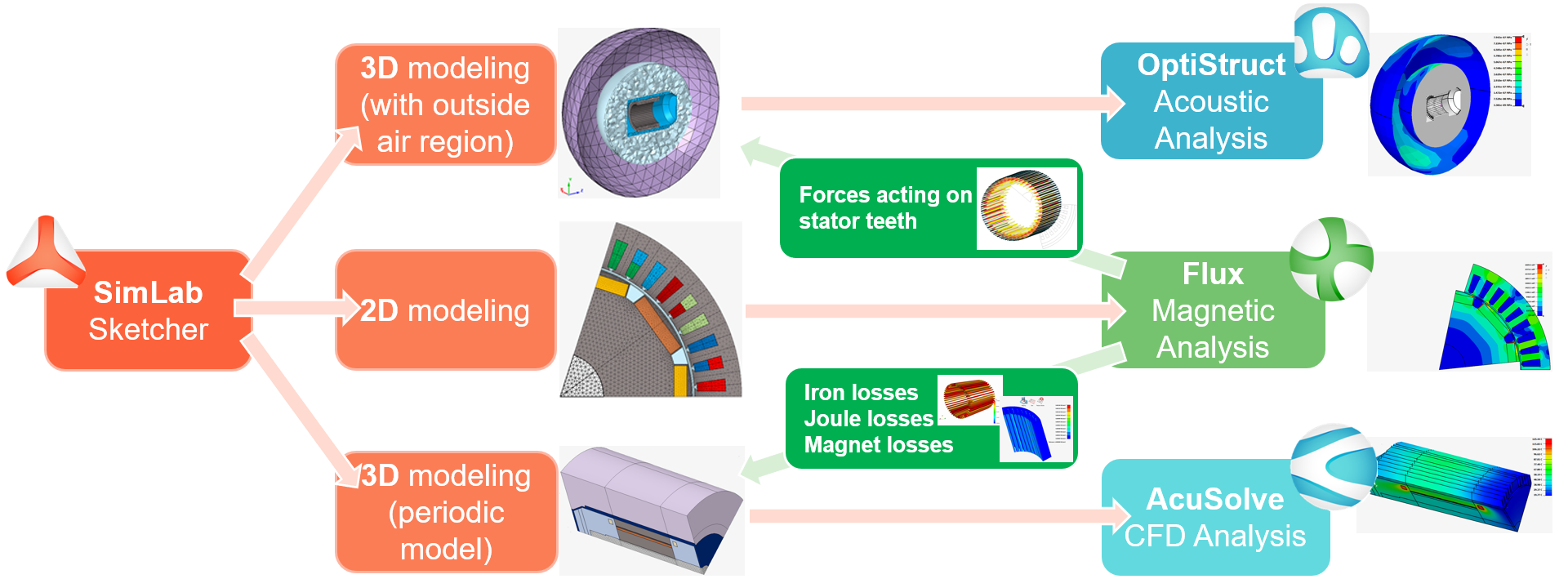 After the 2D transient magnetic is finished, the post-processing results, such as stator tooth electromagnetic forces and loss distribution can be used for further NVH (with OptiStruct) and CFD (with AcuSolve) analysis. The electromagnetic forces acting on stator teeth computed in Flux will be converted to Load Case for OptiStruct to run a 3D NVH analysis. And all loss results obtained with Flux will be converted to Heat Sources for AcuSolve to run a 3D CFD analysis. The multi-physics analysis workflow (with the outside airflow considered) is shown below:
