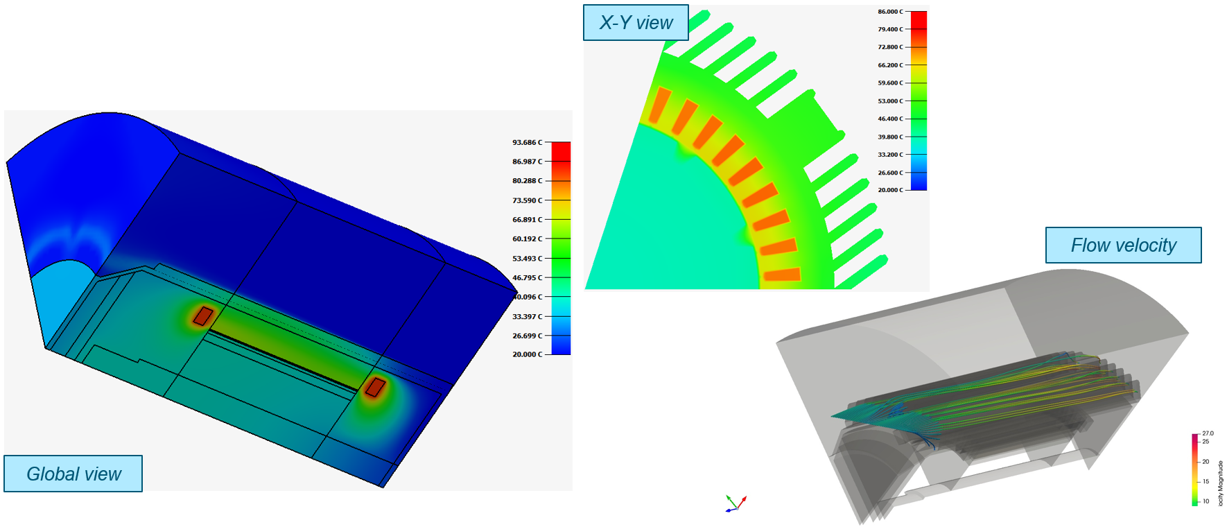 Staring from the 2D transient magnetic analysis, the third step is to analyze its thermal characteristics. In Flux, the most common way is to export the copper loss / iron loss information from the transient magnetic analysis and run the CFD analysis with AcuSolve. The following temperature distribution figure provides a primary analysis of the thermal characteristic inside the motor.