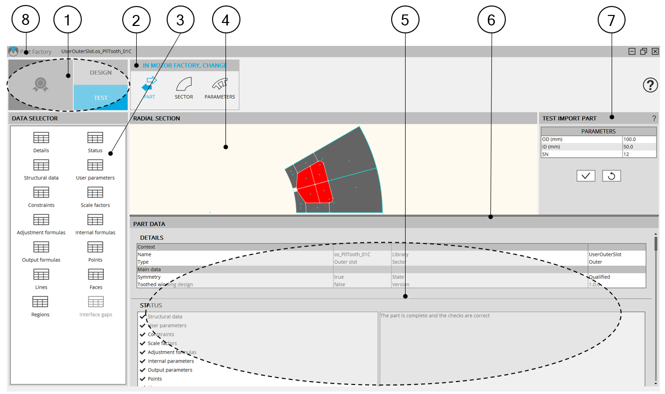 1 | Part Factory has two main environments: DESIGN and TEST. When the TEST is selected, it appears in blue color and it is possible to test the behavior of the considered part. |