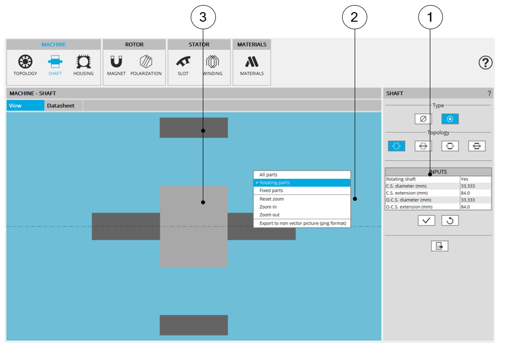 SHAFT design area – Displaying of parts of the motor | |