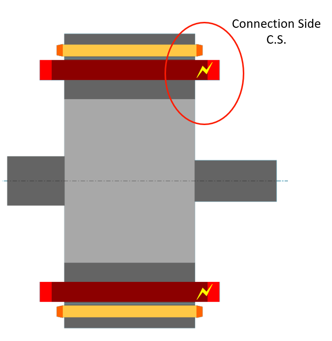 Dimensions are illustrated with arrows | Connection side (C.S.) is identified by yellow lightning. |
