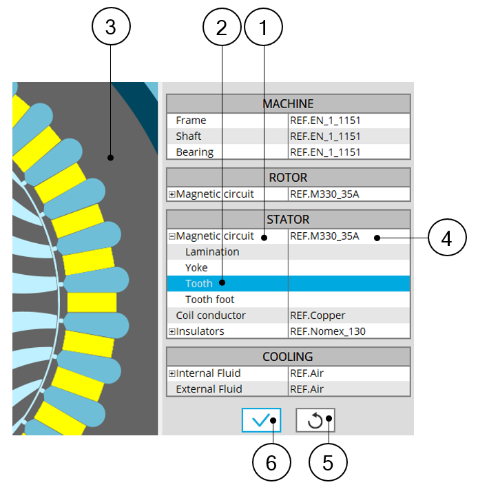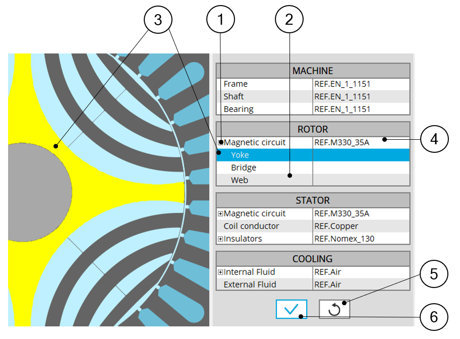 1 Expand the section dedicated to the magnetic circuit.Different materials (LAMINATION type or SOLID type) can be assigned to it.