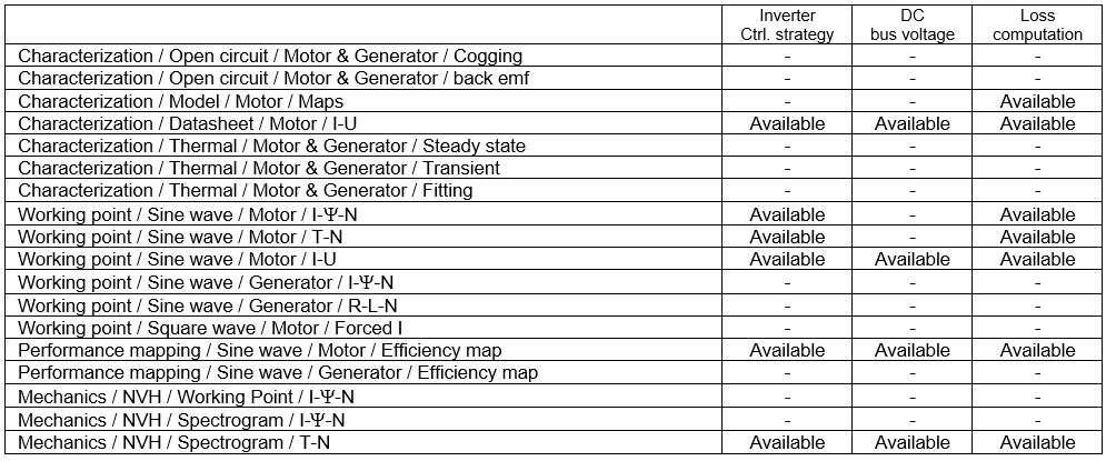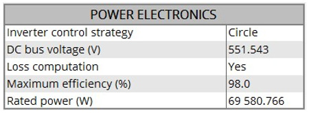 The losses and the efficiency are computed for the machine, the power electronics stage and the system. The “system” gathers the machine and the power electronics stage.