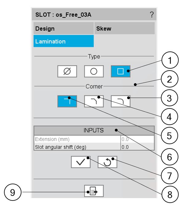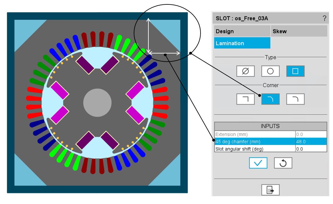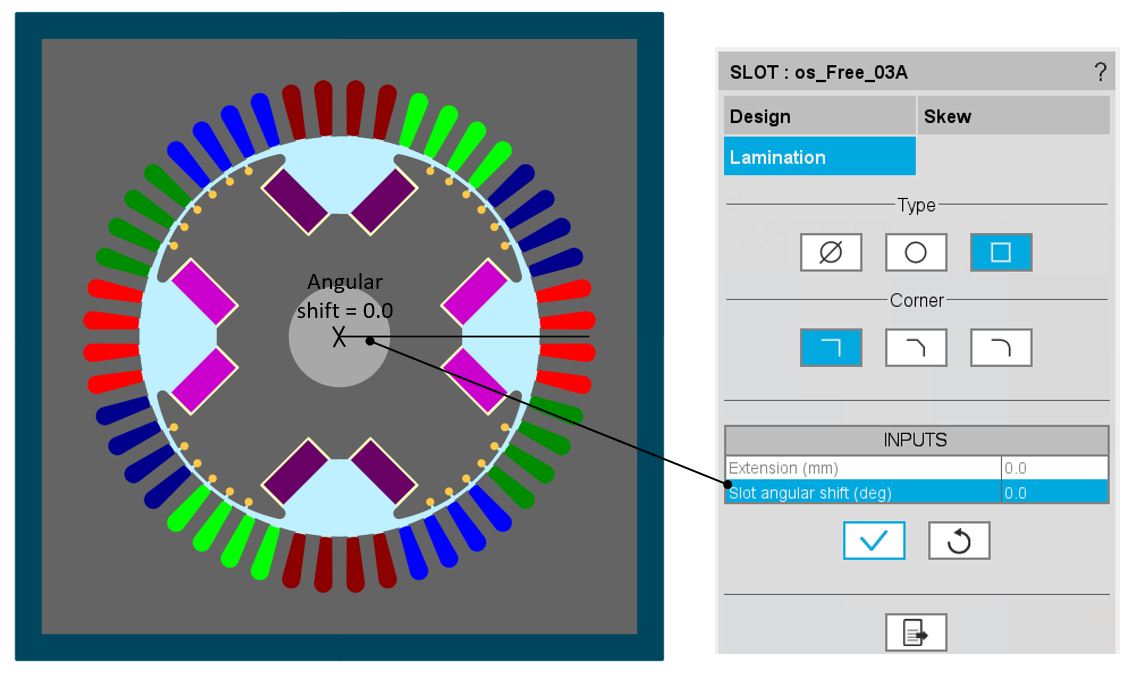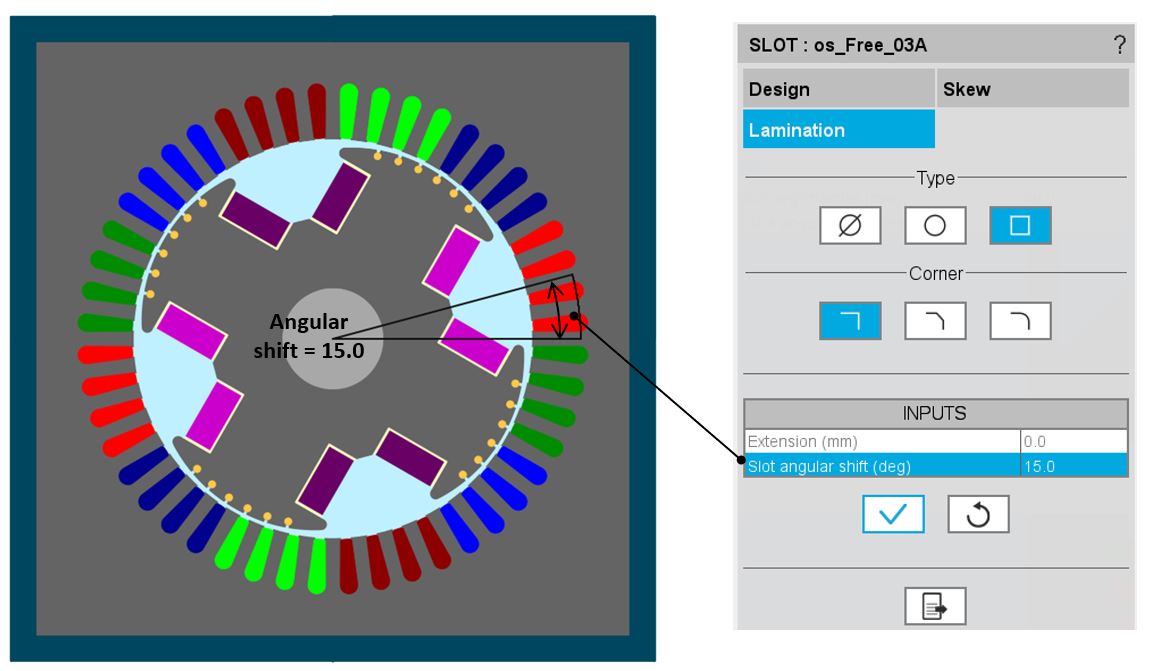 With a square shape lamination, it is possible to set a slot angular shift. It is advised to keep an angular shift lower than one slot pitch.
