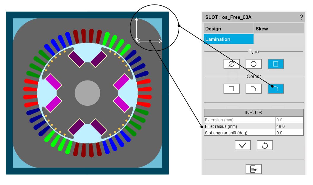 Square shape lamination with fillet cornerSetting of the lamination fillet radius | Square shape lamination with right cornerSee the link with stator outer diameter |