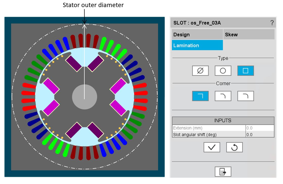 By default, the outer shape of the lamination is defined by considering the outer diameter of the stator (defined in structural data).