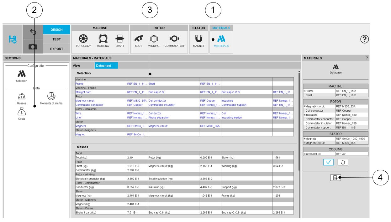 3 | Material datasheet where materials, masses, moment of inertia and costs are displayed |
