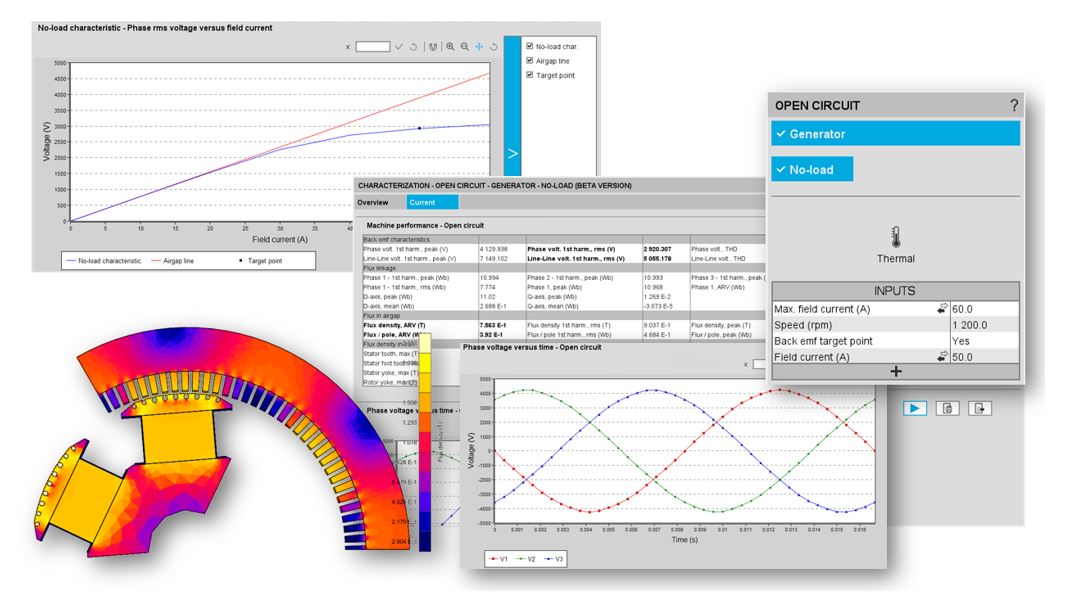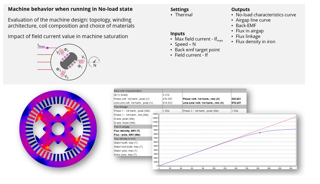 - Machine performance – Open circuit, Back-EMF characteristics (voltage constant and voltage magnitudes), Flux linkage, Flux in airgap, Flux density in iron