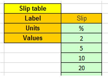 When “Table” is selected, the list of slips to be considered must be defined by using the field: “Slip table” and then clicking on the button “Set values”.