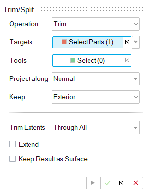- Keep Result as Surface (Trim only): When the result is a solid, faces along the trim are removed and the output is a surface.
