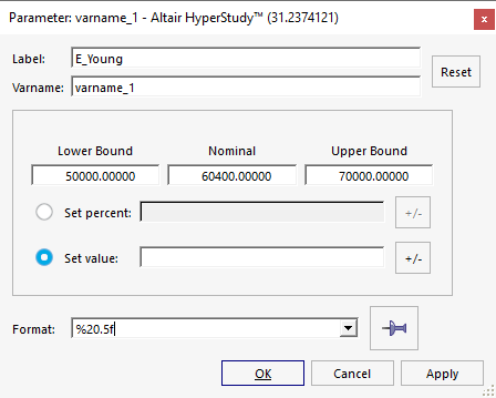 Table 1. Variable Label Lower Bound Nominal Upper Bound Format a a_PlasticityYieldStress 90 110 120 %20.5f b b_HardeningCoeff 100 125 160 %20.5f n n_HardeningExpo 0.1 0.2 0.3 %20.5f sigmax Sigma_Max 250 280 290 %20.5f - Click Save.